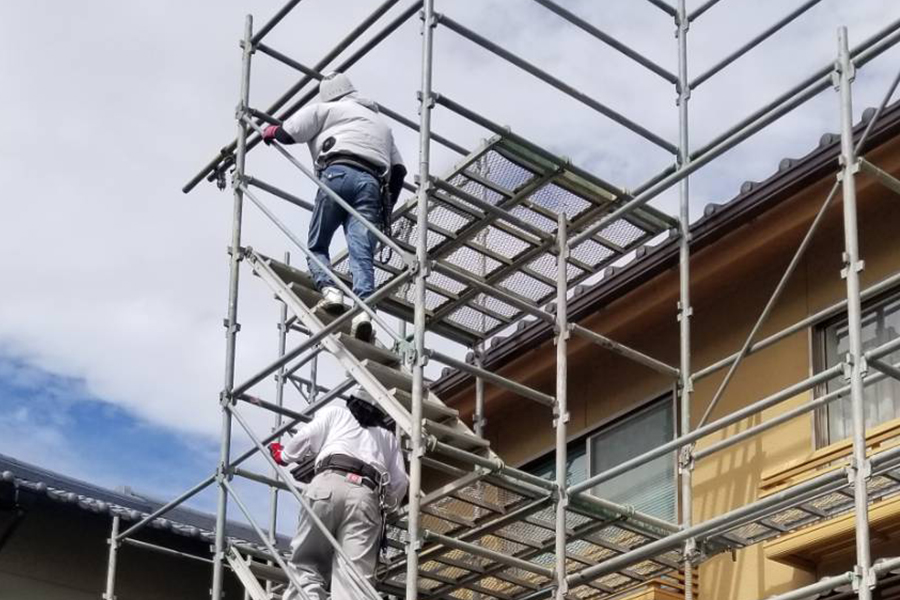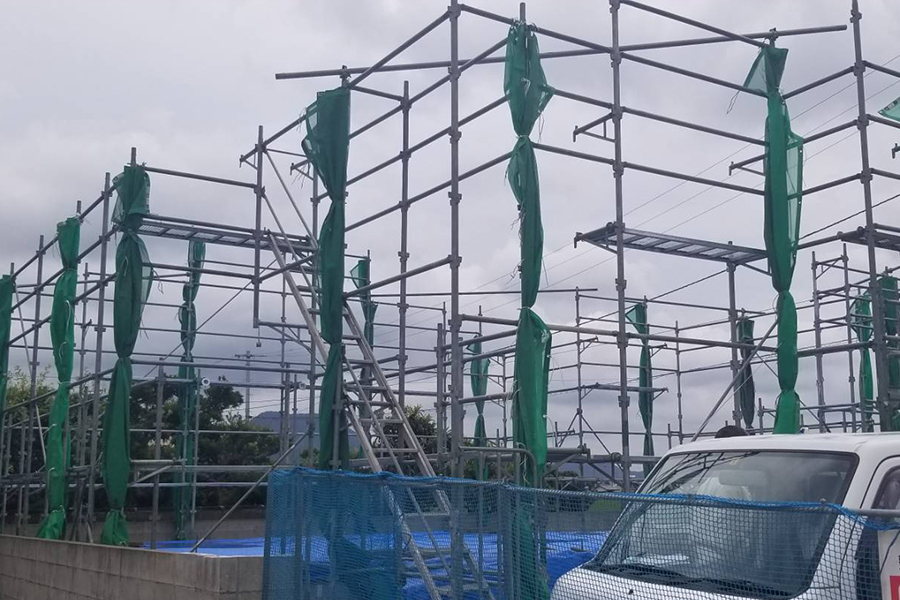 大きく足場工事と言っても使用する業種によって大きく仕様が異なる場合がございます。天野工業では、実際に仕様される職人さんに合わせて最適な足場工事を検討し、安全かつ使いやすい足場を提供する事を心がけております。足場には様々な種類があります。当社では「打ち込み足場(くさび式足場)」という種類を取り扱った施工がメインです。一般戸建て住宅や小規模のアパート・マンションの新築工事・改修工事での足場組立・解体作業を承っております。